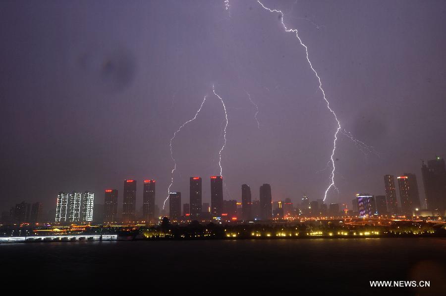 Lightning hits the sky above the urban areas along the Xiangjiang River in Changsha, capital of central China's Hunan Province, March 22, 2015. (Xinhua/Long Hongtao)
