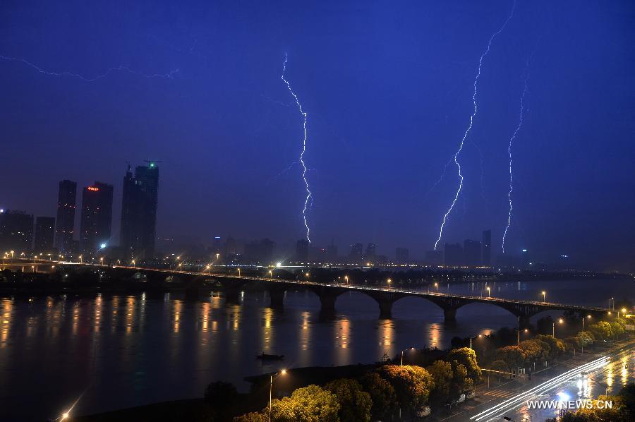 Lightning hits the sky above the urban areas along the Xiangjiang River in Changsha, capital of central China's Hunan Province, March 22, 2015. (Xinhua/Long Hongtao)