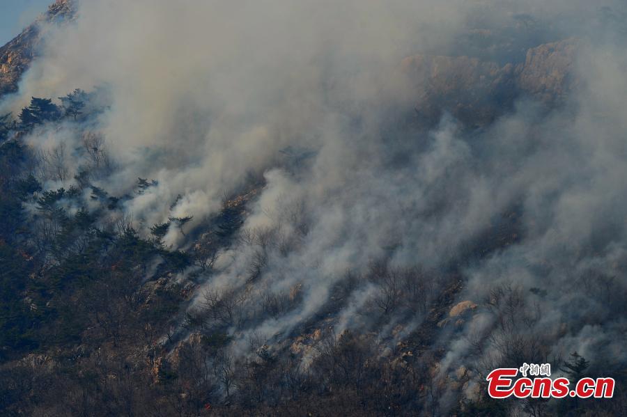 Heavy smoke rises from a fire on Dahei Mountain in Dalian, Northeast China's Liaoning province, March 22, 2015. The mountain caught fire at 2 p.m. on Sunday. (Photo: China News Service/Liu Degang)