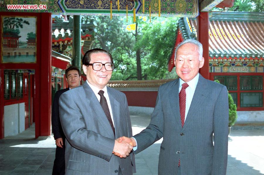 File photo taken on May 18, 1993 shows then Chinese President Jiang Zemin (L) meeting with Lee Kuan Yew, in Beijing, capital of China. Lee Kuan Yew, former prime minister of Singapore, died at 3:18 am on March 23, 2015 at the age of 91, according to a statement released by the Prime Minister's Office (PMO). (Xinhua/Ma Juntian) |