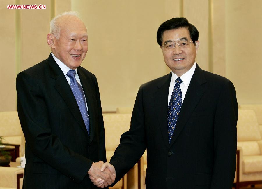 File photo taken on June 19, 2004 shows then Chinese President Hu Jintao (R) meeting with Lee Kuan Yew, in Beijing, capital of China. Lee Kuan Yew, former prime minister of Singapore, died at 3:18 am on March 23, 2015 at the age of 91, according to a statement released by the Prime Minister's Office (PMO). (Xinhua/Yao Dawei) |