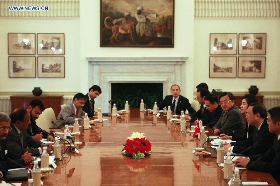 Chinese State Councilor Yang Jiechi (2nd R), who is also Chinese Special Representative on China-India Boundary Question, meets with Indian National Security Advisor Ajit Doval (2nd L) during the 18th round of talks on China-India Boundary Question at Hyderabad House in New Delhi, India, March 23, 2015. (Xinhua/Zheng Huansong) |