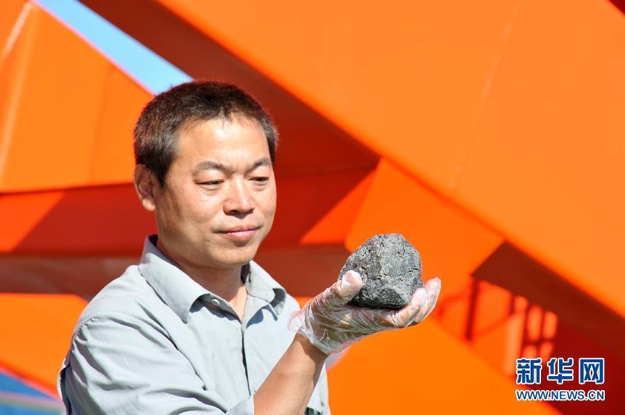 Miao Bingkui, vice president of School of Earth Science, Guilin University of Technology, shows a meteorite on China’s icebreaker Xuelong, March 20, 2014. Chinese researchers found 583 meteorites that fall to Earth at Grove Mountains during 30 years of scientific expedition to the Antarctic. The largest one weighs 1,300 grams, was from Vesta, and get numbered GRV13001. (Photo/Xinhua) |