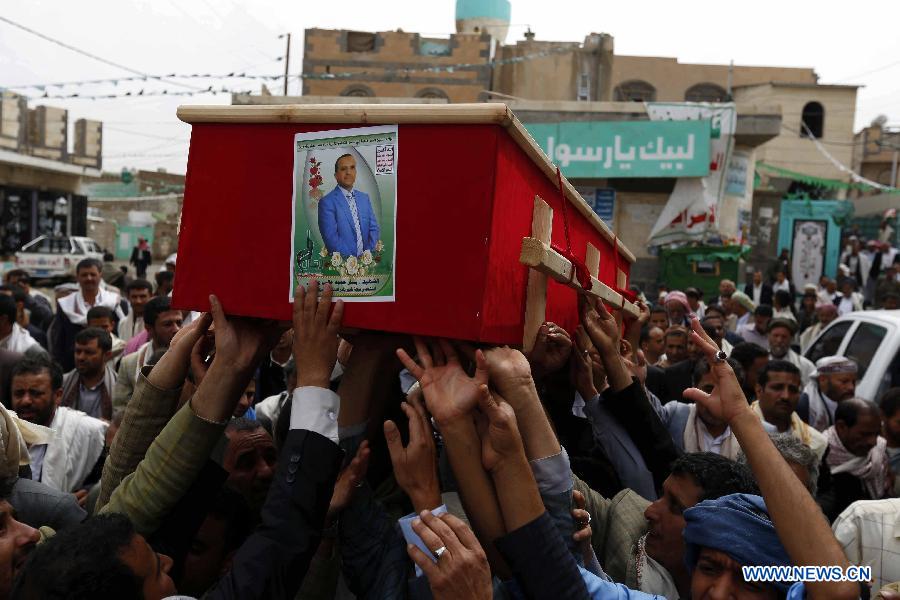People carry a coffin during a funeral for victims in the suicide bombing attacks on mosques on Friday in Sanaa, Yemen, on March 23, 2015. The Yemeni people held a funeral for those who were killed in suicide bombing attacks in Sanaa on Friday. The Islamic State launched four bombing attacks in Yemen on Friday that killed at least 154 people and wounded 350 others. (Xinhua/Hani Ali) |