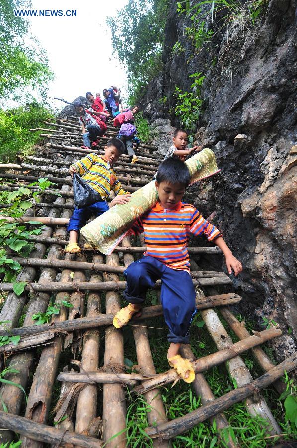 Students walk on a mountain road in Nongding Village of Bansheng County, south China's Guangxi Zhuang Autonomous Region, Sept. 3, 2012. Nongyong Primary School was built in 1964. It is located in Bansheng County, a rural area of karst topography in Guangxi. Its initial school building consists of 12 one-storey houses. In 1990s, a two-storey teaching building and rough dormitory were built. There are about 250 students from all 22 villages of Nongyong. Every Monday, most of them have to walk over hills on their way to the school. In weekdays, about 30 children share seven or eight beds in a small room less than 20 square meters. Their main source of drinking water is recycle of rainwater. However, rough teaching and living facilities did not change their deep desire for knowledge. Investments and donations across the country brought them new dormitory, canteen, bathroom and library. It offered those children a better condition of learning. (Xinhua/Huang Xiaobang) |