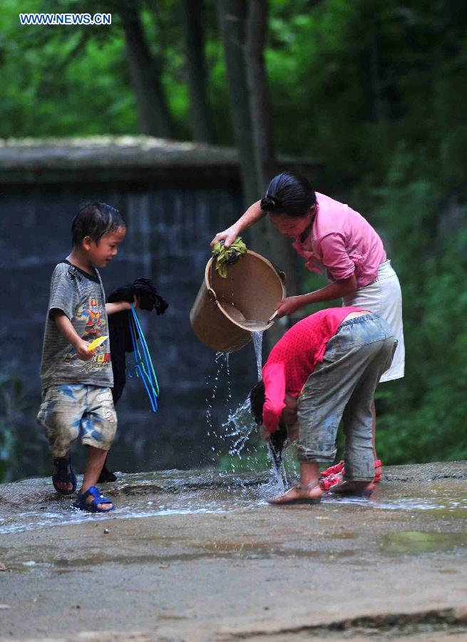 A student washes hair under the help of classmates at Nongyong Primary School in Bansheng County, south China's Guangxi Zhuang Autonomous Region, June 17, 2014. Nongyong Primary School was built in 1964. It is located in Bansheng County, a rural area of karst topography in Guangxi. Its initial school building consists of 12 one-storey houses. In 1990s, a two-storey teaching building and rough dormitory were built. There are about 250 students from all 22 villages of Nongyong. Every Monday, most of them have to walk over hills on their way to the school. In weekdays, about 30 children share seven or eight beds in a small room less than 20 square meters. Their main source of drinking water is recycle of rainwater. However, rough teaching and living facilities did not change their deep desire for knowledge. Investments and donations across the country brought them new dormitory, canteen, bathroom and library. It offered those children a better condition of learning. (Xinhua/Huang Xiaobang) |