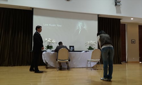 People visit a mourning hall for Lee Kuan Yew at the Singaporean embassy in Beijing on March 23.