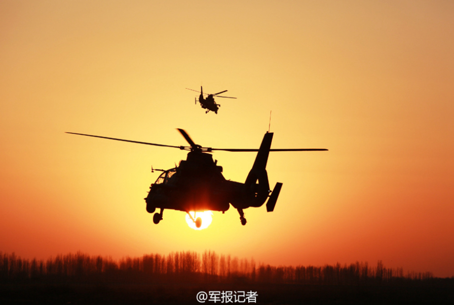 Photo shows China's WZ-19 helicopters fly in formation. Recently, the aviation brigade under PLA's Xinjiang Military Region held helicopter flight training to improve the troop's night combat capability.