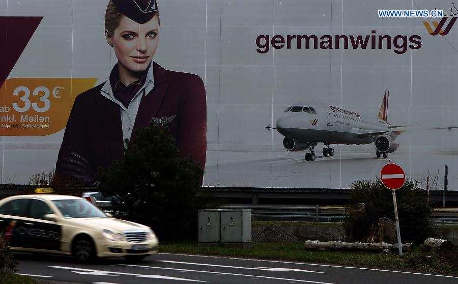 A taxi drives past a poster of Germanwings near its headquarters in Cologne, Germany, on March 24, 2015. There are no Chinese passengers onboard the crashed Germanwings flight 4U9525, "as far as we know today", said Germanwings CEO Thomas Winkelmann on Tuesday. (Xinhua/Luo Huanhuan) |