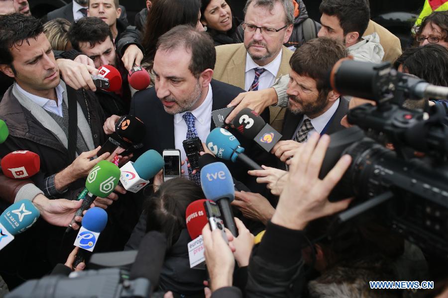 The Catalan Minister of Interior Ramon Espadaler(C) speaks to media at Barcelona's El Prat airport in Barcelona, Spain, on March 24, 2015. An Airbus A320 of the German low-cost airline Germanwings with 150 people on board crashed on Tuesday in southern France, French authorities confirmed. (Xinhua/Pau Barrena) |