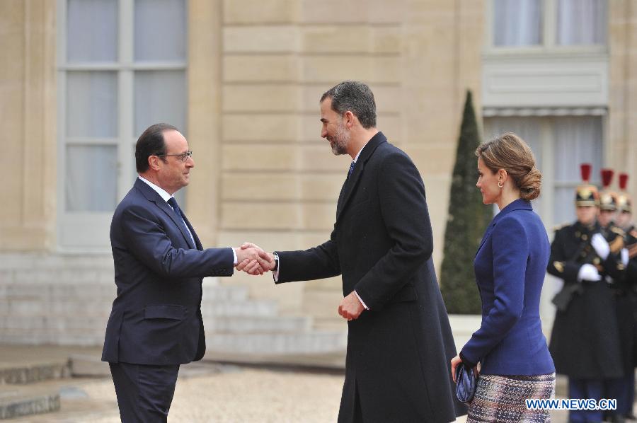 French President Francois Hollande (L) meets with visiting Spanish King Felipe VI at the Elysee Palace in Paris, March 24, 2015. Spanish King Felipe VI, who is on a state visit to France, announced he decided to cancel his visit due to the crash of Germanwings flight 4U9525. (Xinhua/Chen Xiaowei) |