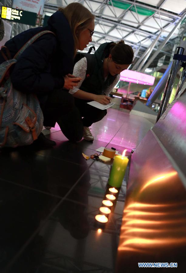 People light candles and write messages to mourn the victims of the crashed plane of Germanwings at the airport in Duesseldorf, Germany, on March 24, 2015. An Airbus A320 of the German low-cost airline Germanwings with 150 people on board crashed on Tuesday in southern France, French authorities confirmed.(Xinhua/Luo Huanhuan) |