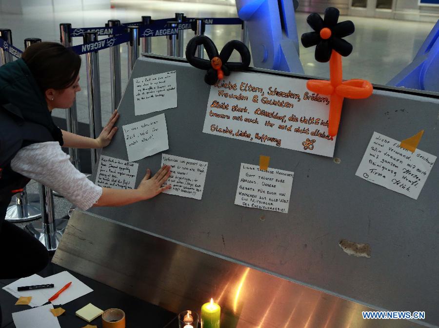A passenger leaves messages to mourn victims of the crashed plane of Germanwings at the airport in Duesseldorf, Germany, on March 24, 2015. An Airbus A320 of the German low-cost airline Germanwings with 150 people on board crashed on Tuesday in southern France, French authorities confirmed.(Xinhua/Luo Huanhuan) |