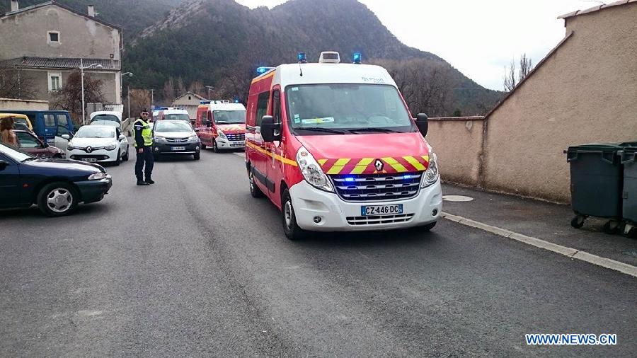 French emergency services vehicles prepare to head for the site where a Germanwings Airbus A320 crashed in Alpes-de-Haute province of France, March 24, 2015. An Airbus 320 plane of German budget airline Germanwings with 150 people on board crashed in southern France on Tuesday while en route from Barcelona to Duesseldorf. No survivors are expected. (Xinhua) |