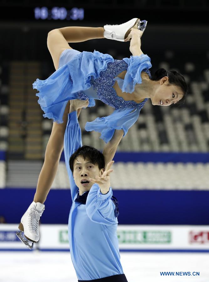Pang Qing and Tong Jian of China take part in their training session before World Figure Skating Championships 2015 at Oriental Sports Center in Shanghai, China on March 24, 2015.(Xinhua/Wang Lili)