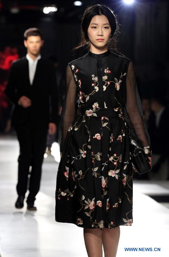 A model presents a creation of Eve de Cina during the China Fashion Week A/W 2015/2016 in Beijing, capital of China, March 24, 2015. (Xinhua/Li Mingfang)