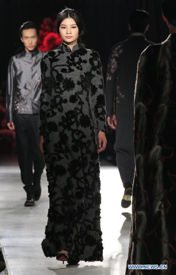 Models present creations of Eve de Cina during the China Fashion Week A/W 2015/2016 in Beijing, capital of China, March 24, 2015. (Xinhua/Li Mingfang)