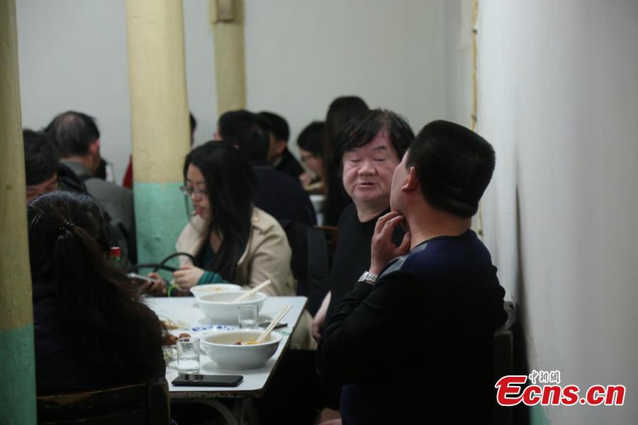 Customers enjoy their noodles in the time-honored Xincheng Noodle House in Qianmen, downtown Beijing, March 24, 2015. The 60-year-old restaurant will close on March 25 due to rocketing rents. It started as a private noodle house and was then nationalized in 1956. Later, it was operated by private owners, featuring the same decor, products and even staff for decades, and has become a mainstay in Qianmen where many historic buildings have been razed in recent years as part of the street's modernization. (Photo: China News Service/Liu Xianguo) |