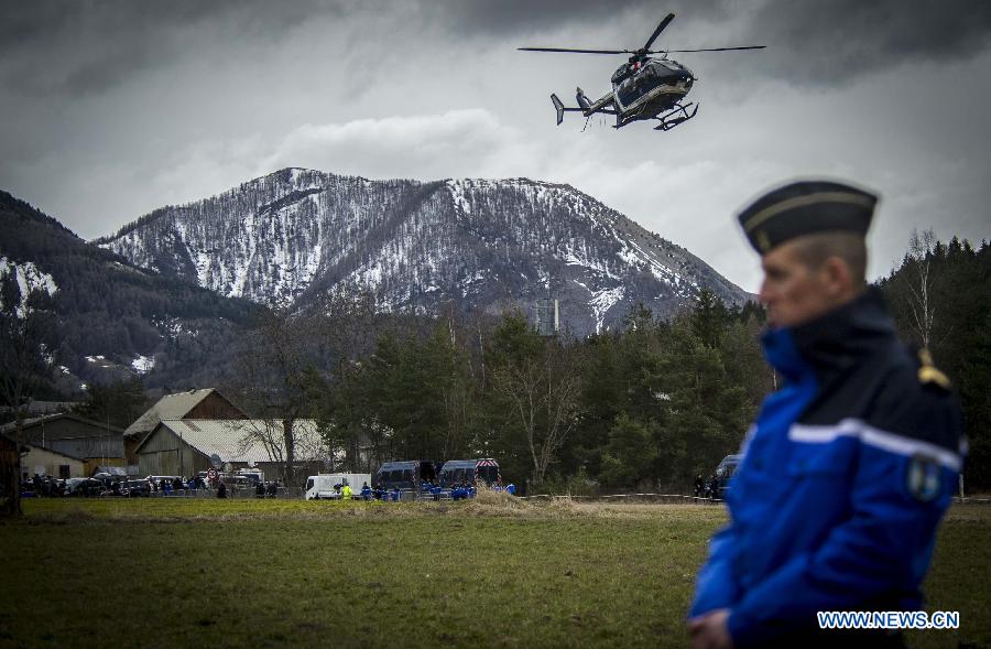 A rescue helicopter sets off to the crash site of Germanwings Airbus A320 plane in the Alps in southern France, March 25, 2015. French gendarmes late Tuesday found one of the two black boxes of the German passenger plane that crashed in southern France with 150 people on board, while a joint international probe into the cause of the accident is under way. (Xinhua/Chen Xiaowei) |