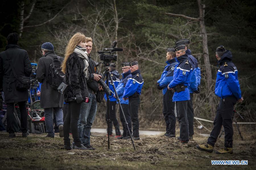 French gendarmes stand guard near the rescue base camp in the Alps in southern France, March 25, 2015. French gendarmes late Tuesday found one of the two black boxes of the German passenger plane that crashed in southern France with 150 people on board, while a joint international probe into the cause of the accident is under way. (Xinhua/Chen Xiaowei)