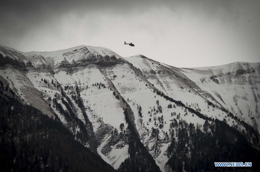 A rescue helicopter flies to the crash site of Germanwings Airbus A320 plane in the Alps in southern France, March 25, 2015. French gendarmes late Tuesday found one of the two black boxes of the German passenger plane that crashed in southern France with 150 people on board, while a joint international probe into the cause of the accident is under way. (Xinhua/Chen Xiaowei) |