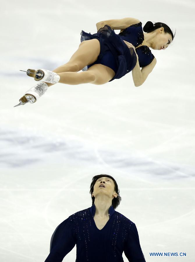 Pang Qing (top) and Tong Jian of China compete during the Pairs Short Program session in ISU World Figure Skating Championships 2015 at Crown Indoor Stadium, Oriental Sports Center in Shanghai, China on March 25, 2015. Pang Qing and Tong Jian took the second place after short program with 72.59 points. (Xinhua/Wang Lili) |