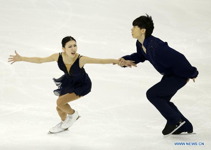 Pang Qing (L) and Tong Jian of China compete during the Pairs Short Program session in ISU World Figure Skating Championships 2015 at Crown Indoor Stadium, Oriental Sports Center in Shanghai, China on March 25, 2015. Pang Qing and Tong Jian took the second place after short program with 72.59 points. (Xinhua/Wang Lili) |