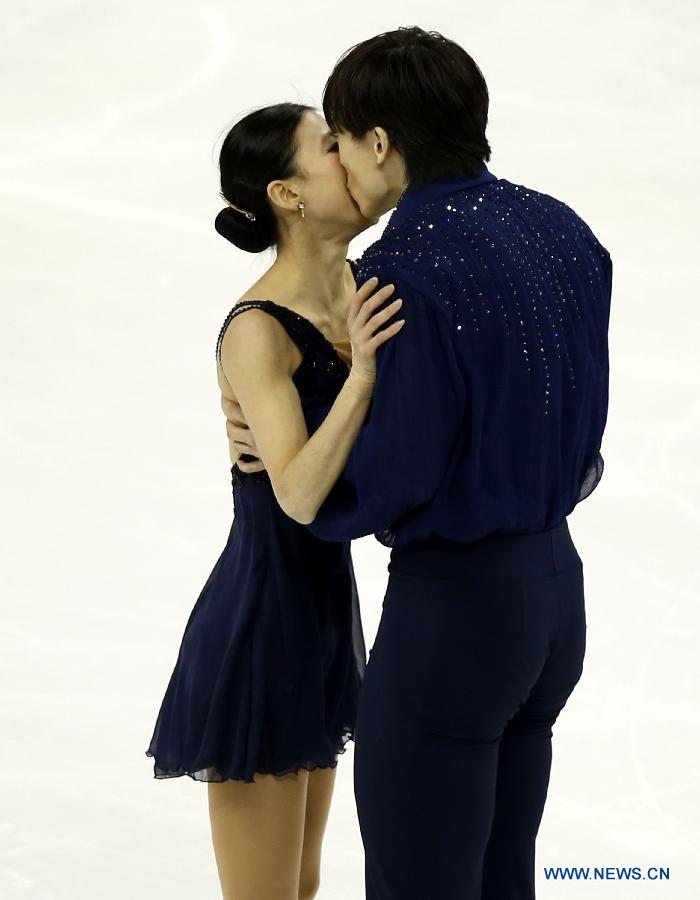 Tong Jian of China kisses his parter Pang Qing after their Pairs Short Program session in ISU World Figure Skating Championships 2015 at Crown Indoor Stadium, Oriental Sports Center in Shanghai, China on March 25, 2015. Pang Qing and Tong Jian took the second place after short program with 72.59 points. (Xinhua/Wang Lili) |