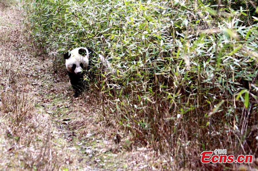 A giant panda eats bamboo at the Changqing Nature Reserve. A report of the fourth panda survey in Shaanxi province, released on March 25, shows that there are about 345 wild giant pandas living in the Qinling Mountains area, an increase of 26.4 percent than the third survey. Most pandas live on the southern slope of the middle section of Qinling Mountains. (Photo provided to China News Service) |