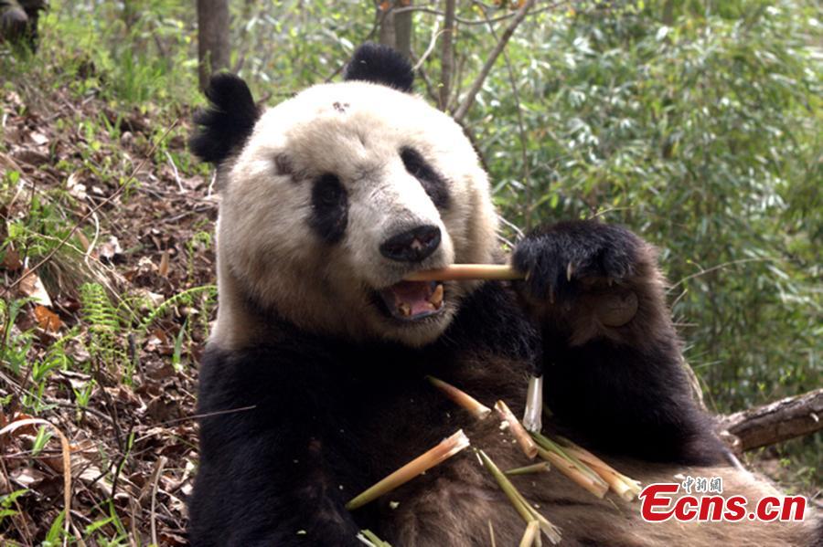 A giant panda eats bamboo at a nature reserve. A report of the fourth panda survey in Shaanxi province, released on March 25, shows that there are about 345 wild giant pandas living in the Qinling Mountains area, an increase of 26.4% than the third survey. Most pandas live on the southern slope of the middle section of Qinling Mountains. (Photo provided to China News Service) |