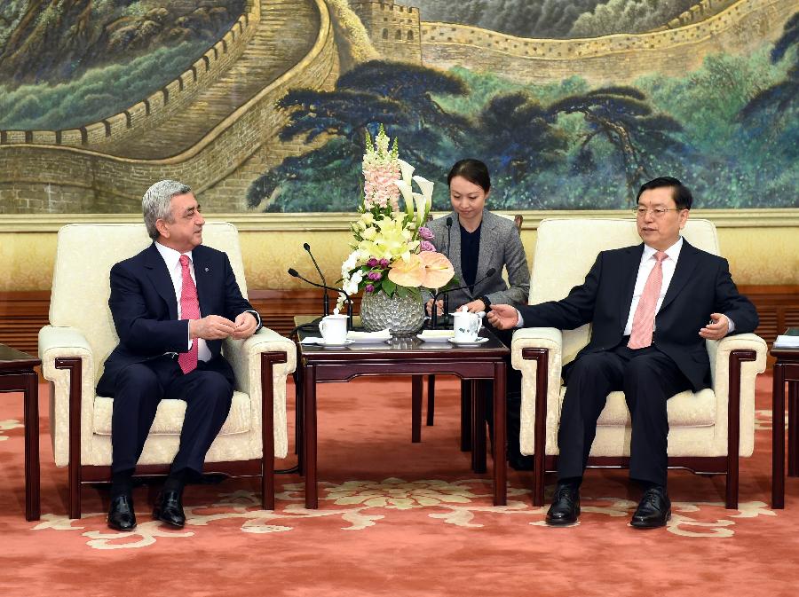 Zhang Dejiang (R), chairman of the Standing Committee of China's National People's Congress, meets with Armenian President Serzh Sargsyan in Beijing, capital of China, March 26, 2015. (Xinhua/Rao Aimin)