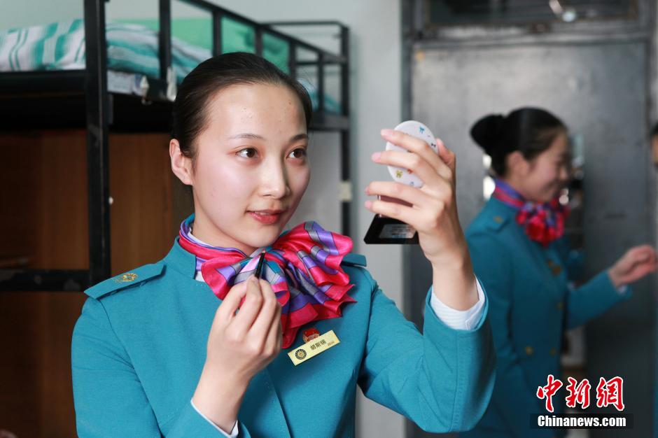 Students of Civil Aviation University of China change new school uniforms on March 24, 2015. The students are from the Flight Techniques College and Cabin Attendant College. (Chinanews/Pang Jie)