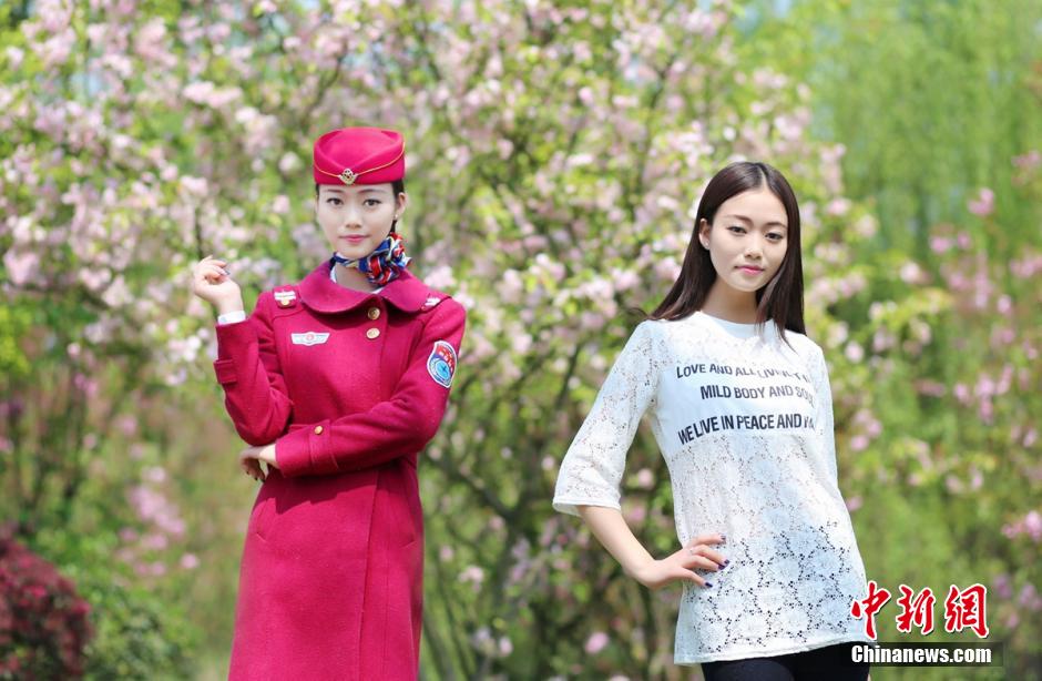 Attendants take photos in uniform or daily clothes against different backgrounds such as cabins and blossoms. They look elegant in uniforms while look lovably in their daily clothes. (Chinanes.com/Zhong Xin)