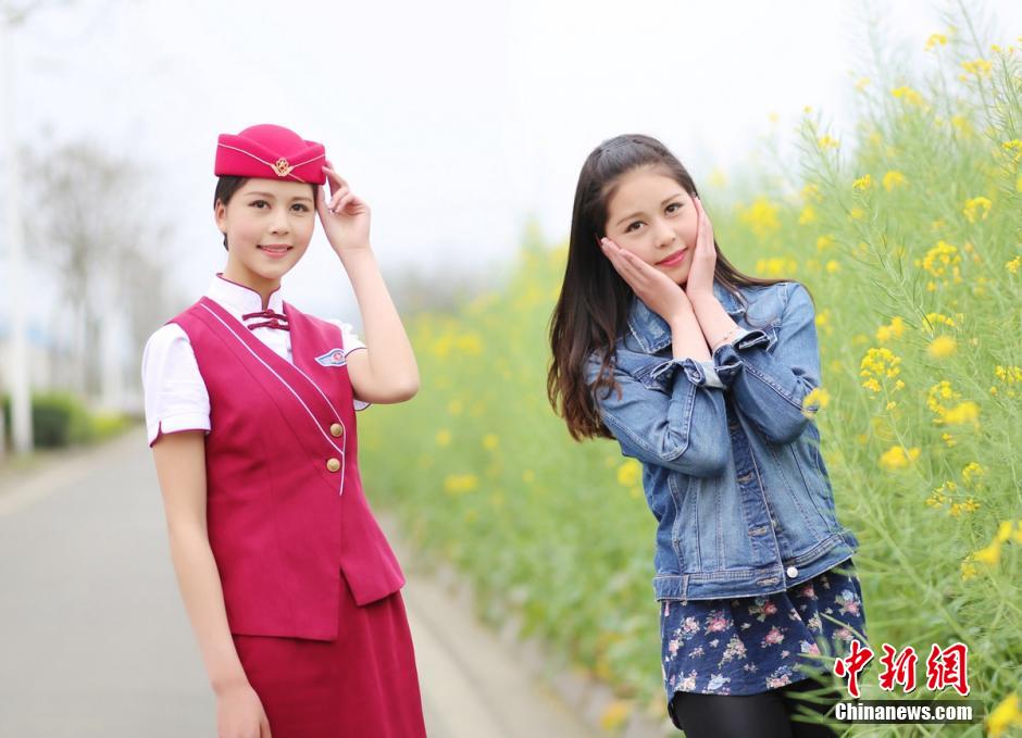 Attendants take photos in uniform or daily clothes against different backgrounds such as cabins and blossoms. They look elegant in uniforms while look lovably in their daily clothes. (Chinanes.com/Zhong Xin)