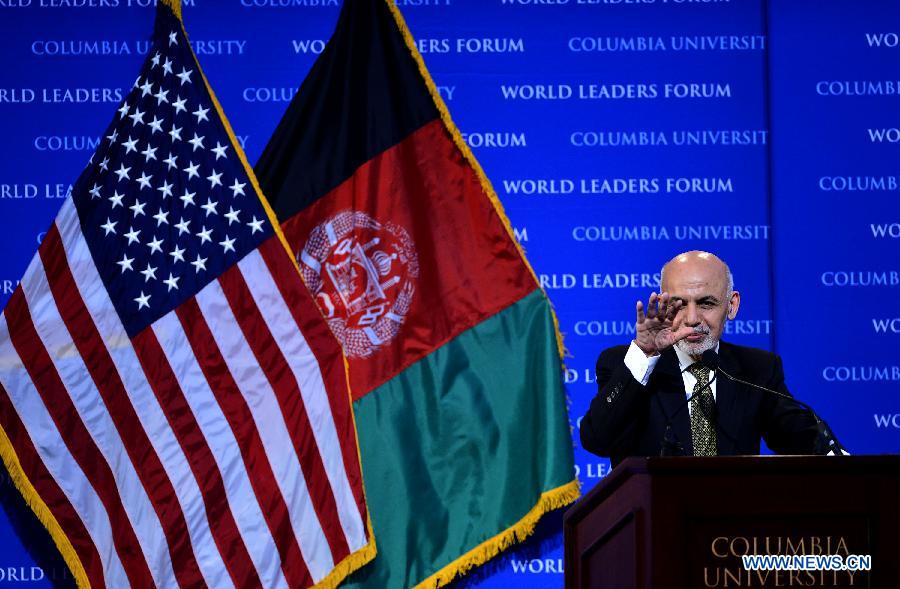 Afghan President Ashraf Ghani speaks during Columbia's World Leaders Forum at Columbia University in New York, the United States, on March 26, 2015. (Xinhua/Wang Lei)