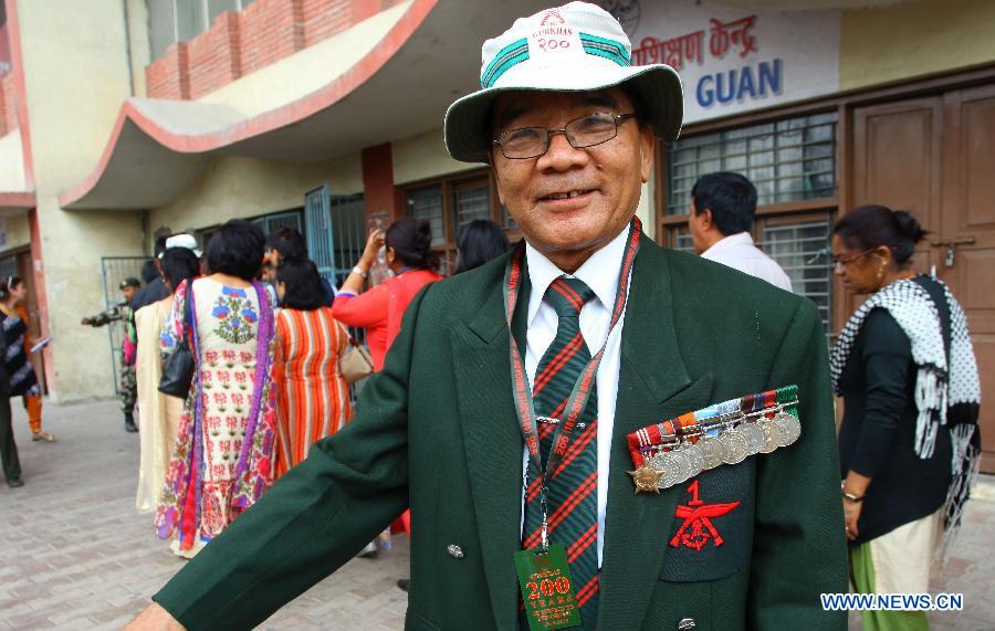 A retired British Gurkha participates in the commemoration of 200 years of service in the British Army in Kathmandu, Nepal, March 26, 2015. The United Kingdom's Brigade of Gurkhas commemorates 200 years of outstanding service and loyalty to the crown in 2015. (Xinhua/Sunil Sharma) |