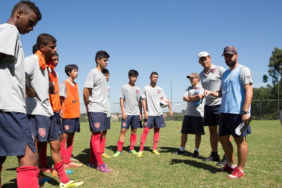 Young players from China and Brazil have a briefing from the coach prior to a training at Luneng Brazil Sports Center in Porto Feliz, Brazil, March 25, 2015. As a milestone of China's Shandong Luneng Football Club's youth training project, Luneng Brazil Sports Center opend in mid-July of 2014. The 160,000-square-meter sports center, located about 100 kilometers outside Brazil's largest city Sao Paulo, has five standard pitches and two futsal fields. It can accommodate 190 people and includes player apartments, a restaurant, gym, physical therapy room, activity room, meeting room and swimming pool. As the Brazilian base, the Luneng Brazil Sports Center is not only for the youth of Luneng football club, but also for domestic and international club teams and national teams at all levels. The best players aged between 14 and 17 will be selected from Luneng Football School and come to Brazil to learn football techniques and participate in the Brazilian youth league. In order to be rooted in the atmosphere of Brazilian football, Luneng worked out a newly-designed training plan. Chinese players will join the Brazilian players of the same age to train and compete together. They live in the same dormitory, eat in the same canteen, help each others so that they can learn from each others. (Xinhua/Xu Zijian) |