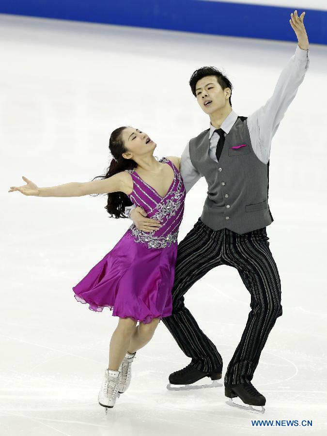 Wang Shiyue (L) and Liu Xinyu of China compete during Ice Dance Free Dancing segment in ISU World Figure Skating Championships 2015 at Crown Indoor Stadium, Oriental Sports Center in Shanghai, China, on March 27, 2015. Wang Shiyue and Liu Xinyu took 128.77 points in total. (Xinhua/Wang Lili)