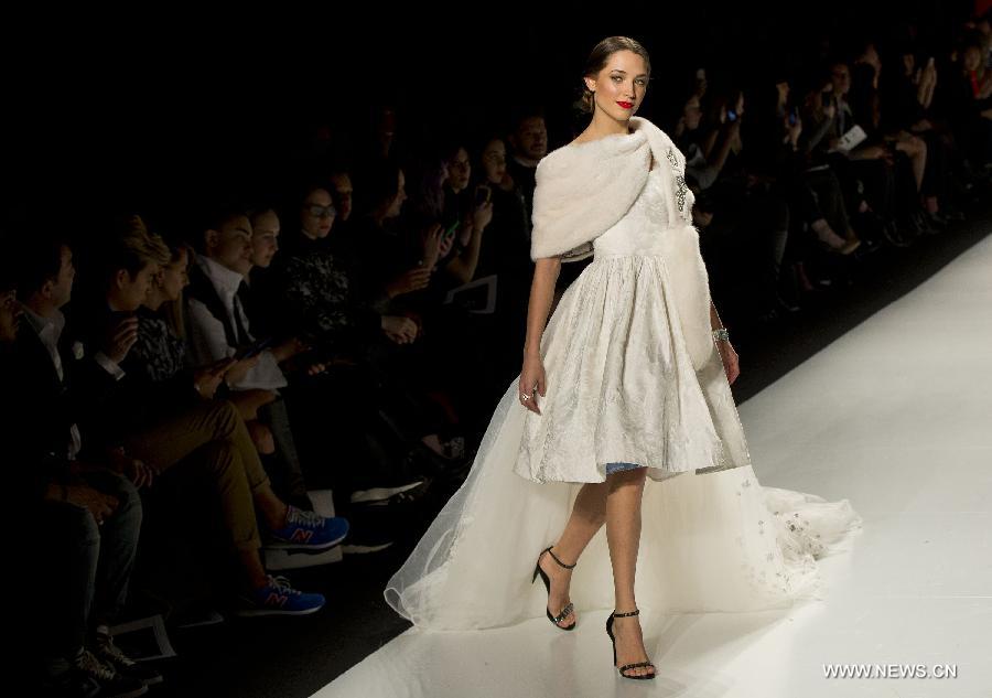 A model presents a creation of Farley Chatto's Czar Nicholas Collection during the World MasterCard Toronto Fashion Week Fall 2015 in Toronto, Canada, March 26, 2015. (Xinhua/Zou Zheng)