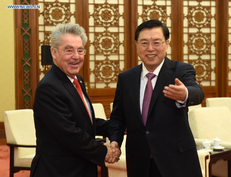 Zhang Dejiang (R), chairman of the Standing Committee of China's National People's Congress, meets with Austrian President Heinz Fischer at the Great Hall of the People in Beijing, capital of China, March 27, 2015. (Xinhua/Li Xueren)