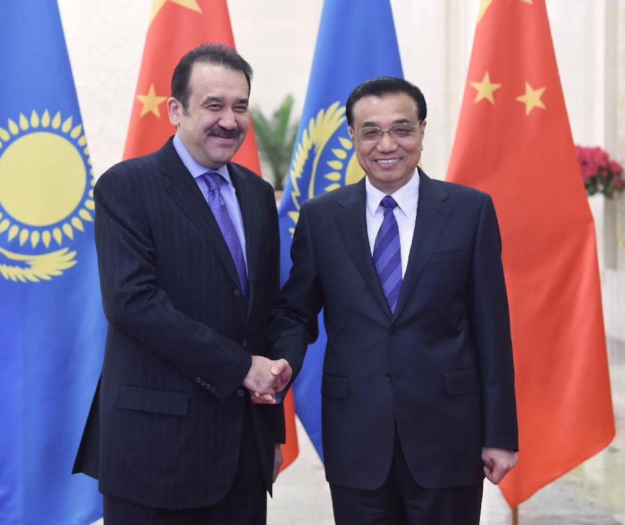 Chinese Premier Li Keqiang (R) holds talks with Kazakh Prime Minister Karim Masimov at the Great Hall of the People in Beijing, capital of China, March 27, 2015. (Xinhua/Zhang Duo) |