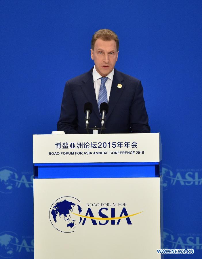Russian First Deputy Prime Minister Igor Shuvalov addresses the opening ceremony of the 2015 annual conference of the Boao Forum for Asia (BFA) in Boao, south China's Hainan Province, March 28, 2015. Shuvalov said Saturday Russia decided to join the Asian Infrastructure Investment Bank (AIIB). (Xinhua/Zhao Yingquan) |