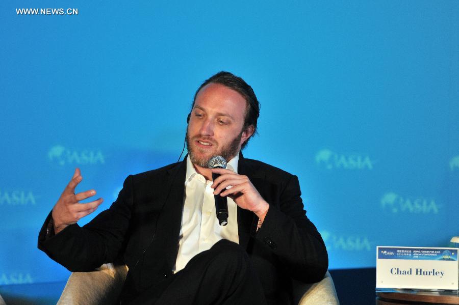 Chad Hurley, co-founder and former chief executive officer of YouTube, speaks during a sub-forum with the theme of "Entrepreneurs: Born or Made?" at the 2015 Boao Forum for Asia (BFA) in Boao, south China's Hainan Province, March 28, 2015. (Xinhua/Yang Guanyu) |