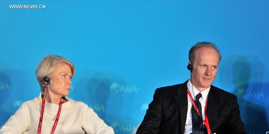 Gail D. Fosler (L), President of the GailFoster Group, and Mark Machin, President of Canada Pension Plan Investment Board Asia Inc., attend a sub-forum with the theme of "Shadow Banking: The Good and Bad" during the 2015 Boao Forum for Asia (BFA) in Boao, south China's Hainan Province, March 28, 2015. (Xinhua/Yang Guanyu) |