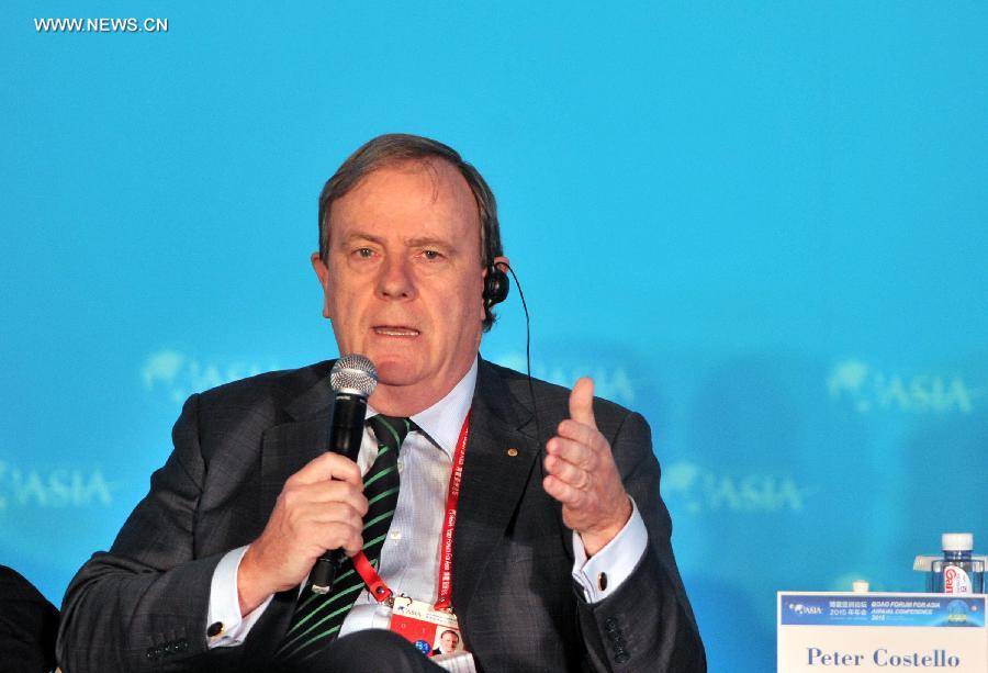 Peter Costello, former Australian Treasurer and Chair of the Board of Guardians of the Australian Future Fund, speaks at a sub-forum with the theme of "Shadow Banking: The Good and Bad" during the 2015 Boao Forum for Asia (BFA) in Boao, south China's Hainan Province, March 28, 2015. (Xinhua/Yang Guanyu) |