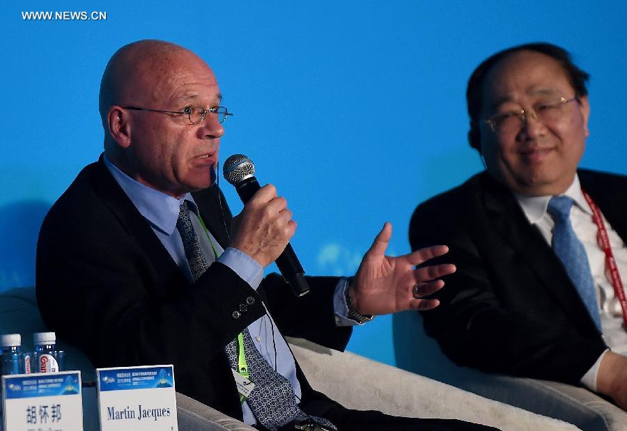 Martin Jacques (L), senior fellow of Department of Politics and International Studies of Cambridge University, speaks during a sub-forum with the theme of "Asian Infrastructure Investment Bank (AIIB) and the New Development Bank" at the 2015 Boao Forum for Asia (BFA) in Boao, south China's Hainan Province, March 28, 2015. (Xinhua/Guo Cheng)