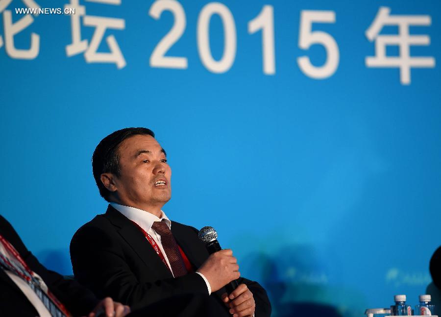 Hu Huaibang, chairman of China Development Bank, speaks during a sub-forum with the theme of "Asian Infrastructure Investment Bank (AIIB) and the New Development Bank" at the 2015 Boao Forum for Asia (BFA) in Boao, south China's Hainan Province, March 28, 2015. (Xinhua/Guo Cheng)