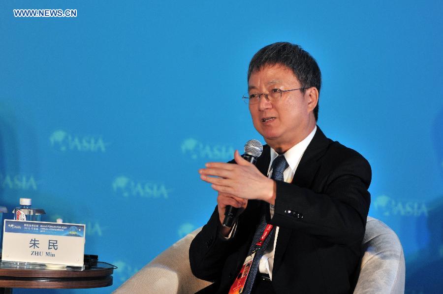 Deputy Managing Director of International Monetary Fund Zhu Min speaks at the sub-forum with the theme of "The Next Financial Crisis" during the 2015 Boao Forum for Asia (BFA) in Boao, south China's Hainan Province, March 28, 2015. (Xinhua/Yang Guanyu)
