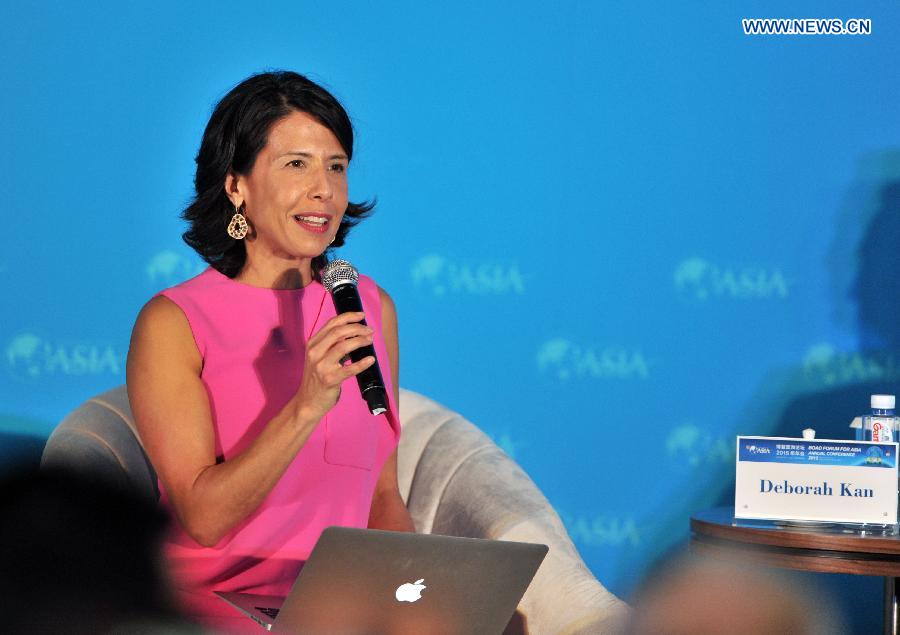 Deborah Kan, executive producer of Wall Street Journal, speaks at a sub-forum with the theme of "The Next Financial Crisis" during the 2015 Boao Forum for Asia (BFA) in Boao, south China's Hainan Province, March 28, 2015. (Xinhua/Yang Guanyu)