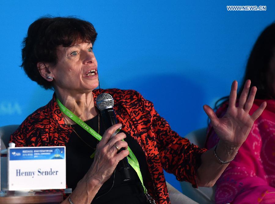 Chief Correspondent for International Finance of "Financial Times" Henny Sender, speaks at the sub-forum with the theme of "India: Resetting the Reform Agenda" during the 2015 Boao Forum for Asia (BFA) in Boao, south China's Hainan Province, March 28, 2015. (Xinhua/Guo Cheng) |